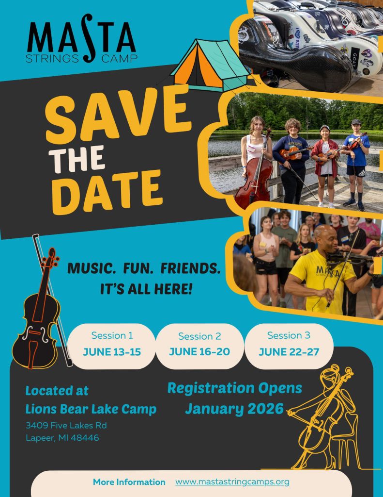 The mission of the MASTA String Camps is to extend students’ musicianship and playing skills, regardless of their current performance level, in a motivating and encouraging atmosphere while also developing students socially and emotionally. The camps consist of three sessions that are held annually in late June at the Howell Nature Center in Howell, Michigan. MASTA String Camps provide young string students with the opportunity to have a specialized camp experience on their instrument. While at camp students participate in orchestra, sectionals, small ensembles, as well as electives and recreation activities.