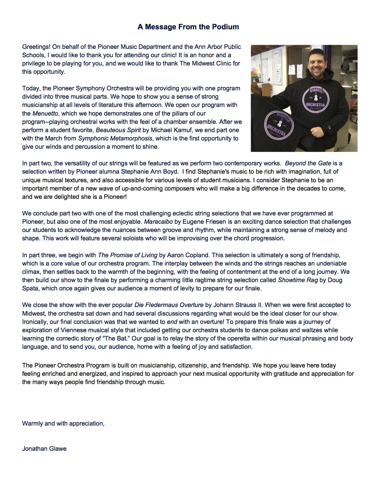 On behalf of the Pioneer Symphony Orchestra, I would like to formally