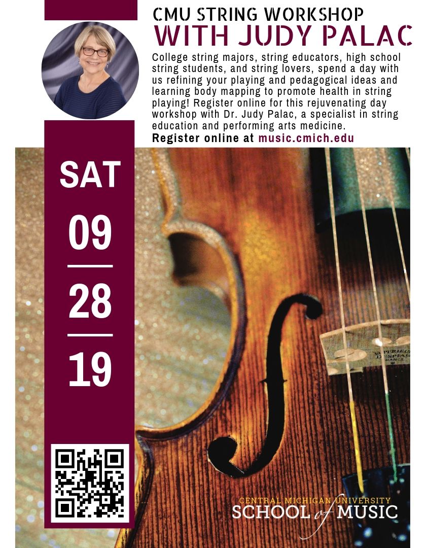 I hope your school year is off to a great start. CMU will be hosting Dr. Judy Palac for a string workshop on Saturday, 9/28/2019, from 1 -5 pm. I would like to invite all Michigan string educators, college music majors, and high school string students to join us for this exciting day. The event details and online registration is available now. Please let me know if you have any questions. A PDF flyer is attached, and please feel free to print and post as you wish. Hope to see many of you later this month!