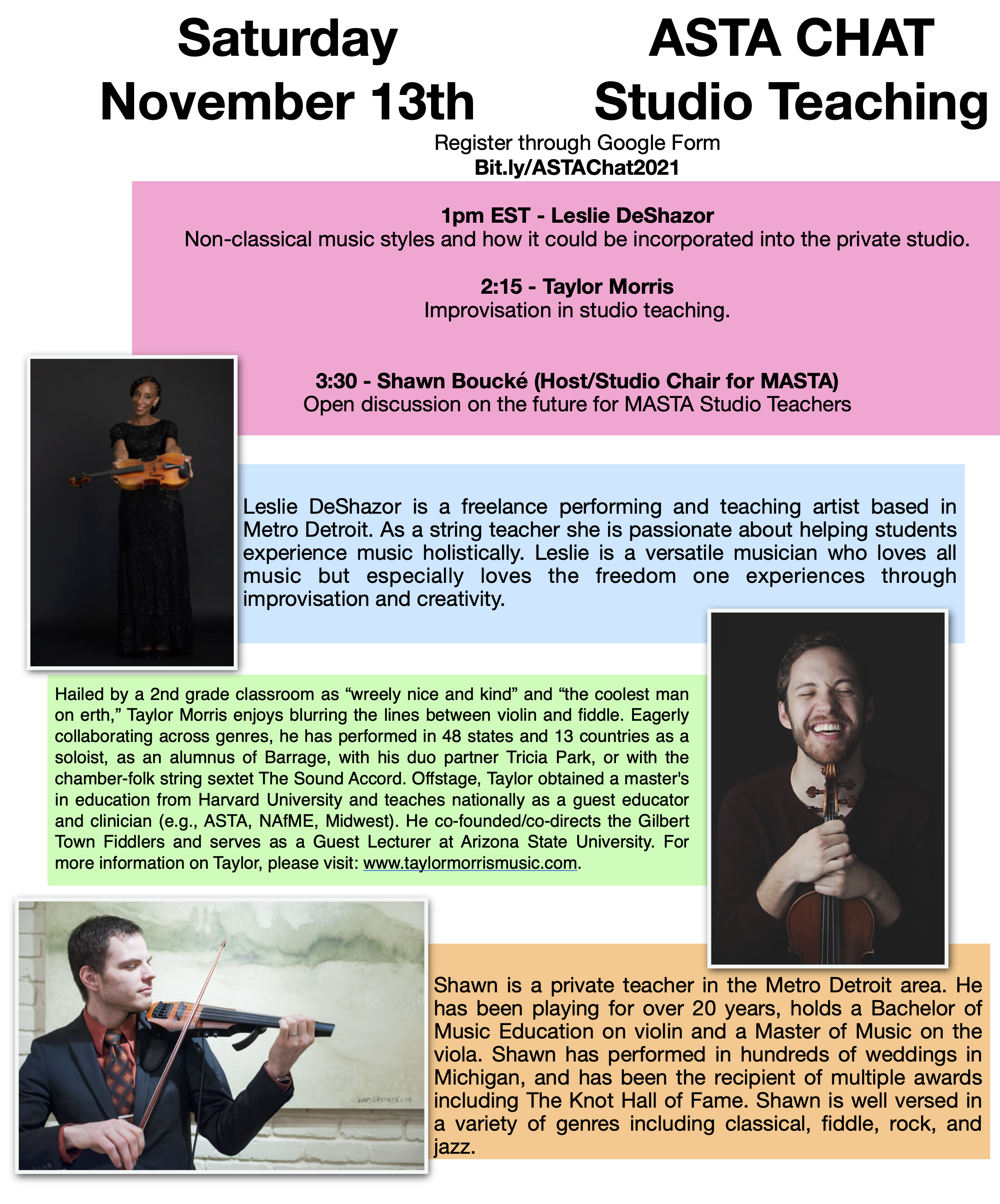 I will be hosting a FREE mini conference on November 13th. This "ASTA Chat" will focus on contemporary techniques in the private studio. We have two amazing speakers, Leslie DeShazor and Taylor Morris. After the two sessions I will also be hosting a discussion where I will discuss my plans for next year and will be open to hear your suggestions with what you would like to see with the future of MASTA for studio teachers.